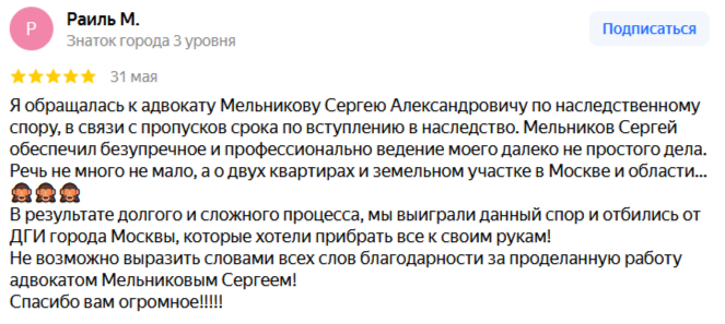 Если Вы единственный наследник и пропустили 6 месячный срок для подачи заявления нотариусу, но фактически приняли открывшееся наследство, а ДГИ оспаривает ваши права на недвижимое имущество, самое разумное решение – идти к практикующему юристу в этой области, имеющему практику участия в спорах с ДГИ города Москвы.